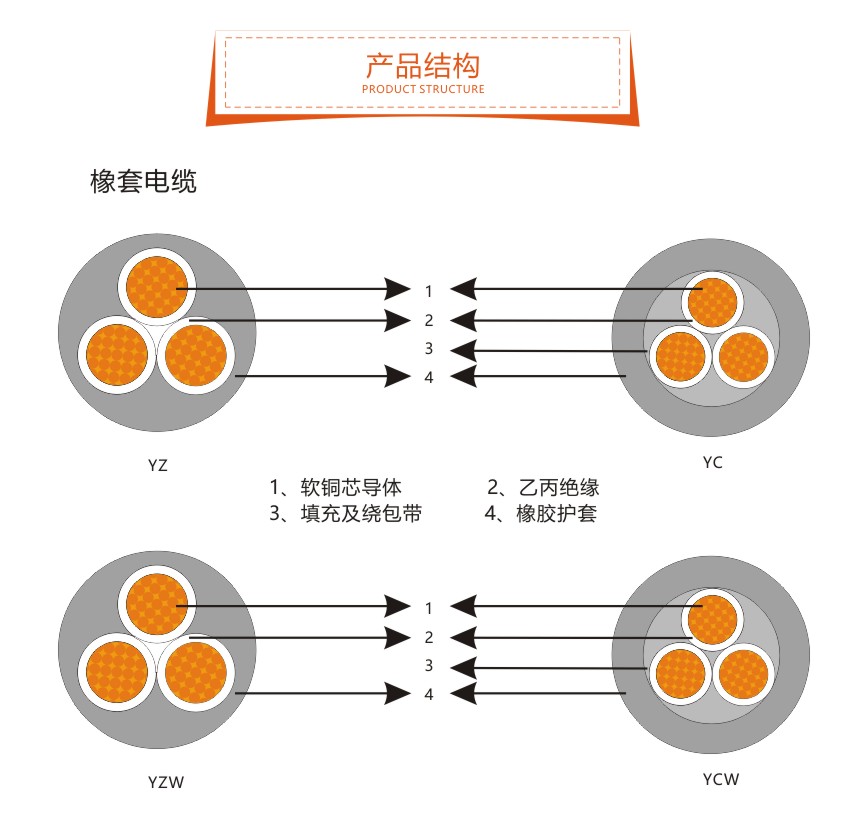 橡套電纜分為重型橡套軟電纜(YC電纜,YCW電纜),中型橡套軟電纜(YZ電纜,YZW電纜),輕型橡套軟電纜(YQ電纜,YQW電纜),防水橡套軟電纜(JHS電纜,JHSB電纜),電焊機電纜(YH電纜,YHF電纜)YHD電纜為野外用鍍錫電源連接線。